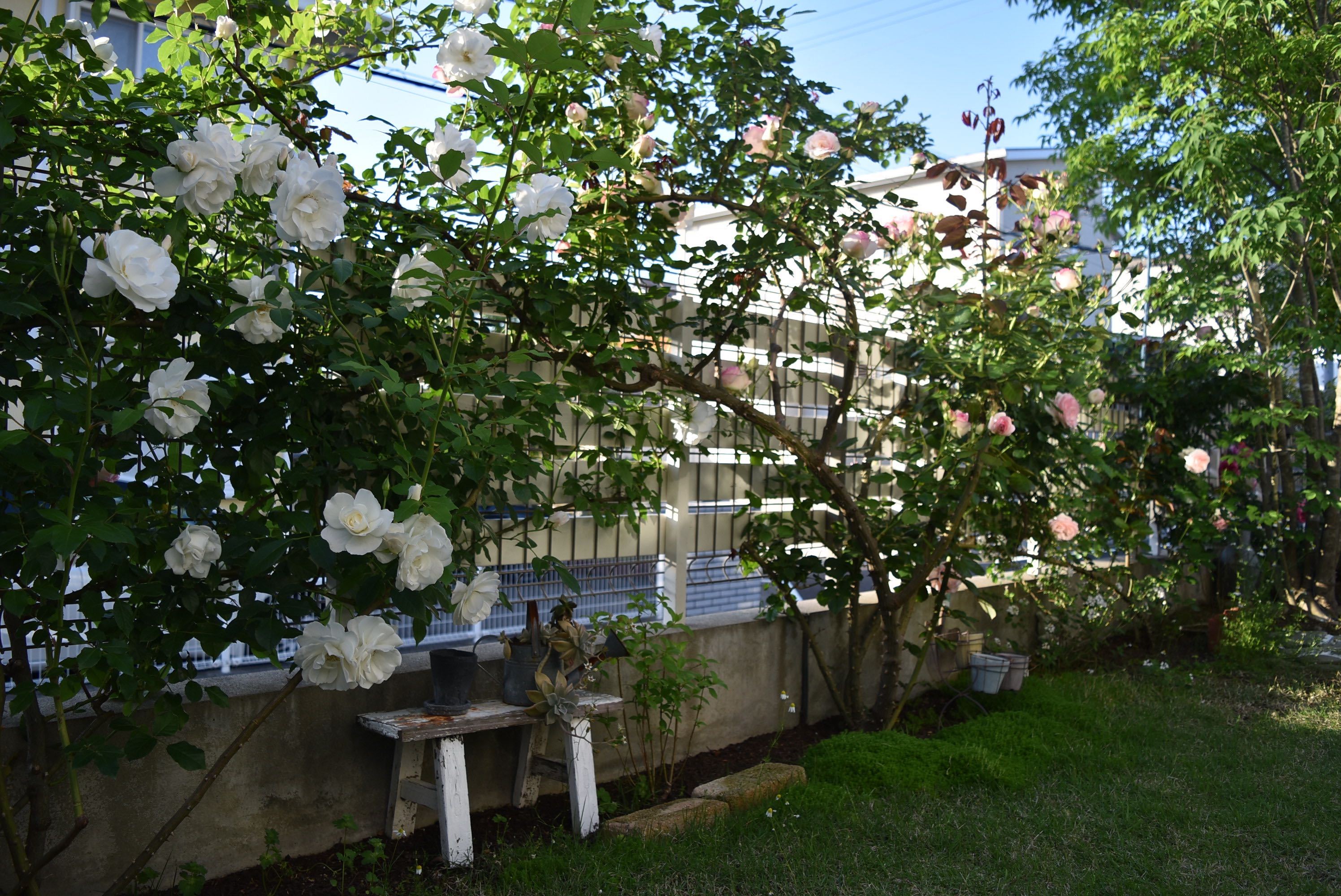白の「つるアイスバーグ」と赤の「ルージュ・ピェール・ドゥ・ロンサール」。