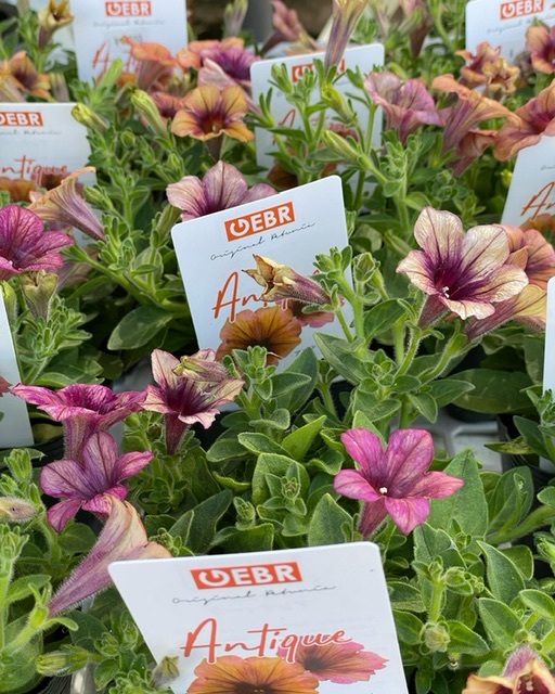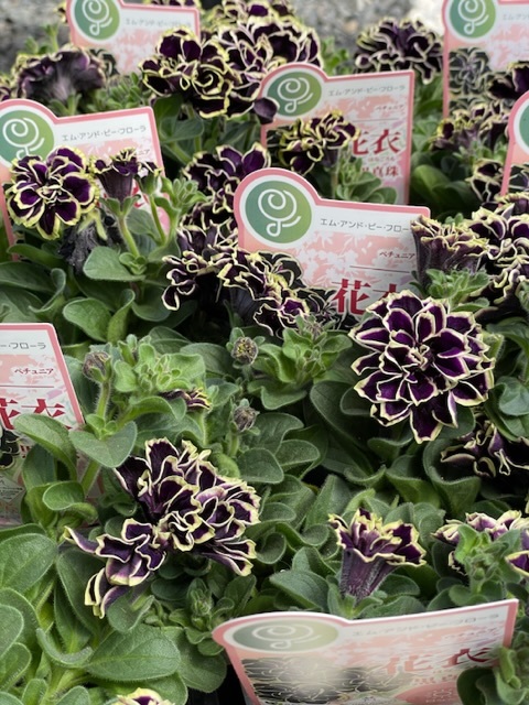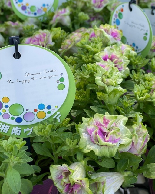 ペチュニア湘南シリーズ「湘南ヴェルデ」「湘南ローザヴェルデ」新品種「湘南ラテヴェルデ」、ゲブラナガトヨさんのペチュニア「花舞姫」新品種ペチュニア「アンティーク」、花日和さんのペチュニア・ホイップマカロンシリーズ「メロンクリーム」、ペチュニア・花衣「黒真珠」